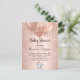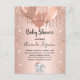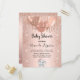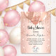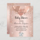 Pour un baby shower, célébrer une petite fille. Un arrière - plan rose à l'apparence métallique. Décoré d'or rose, de gouttes de parties scintillant rose, d'un look décapant de peinture, de ballons et d'une mignonne petite fille d'éléphant. Personnalisez et ajoutez le nom de la mère à être le nom et les détails de la fête. Le nom et le texte : Baby shower sont écrits avec un script de style écrit à la main. Retour : arrière - plan rose en or avec gouttes de parties scintillant, design de carte postale. Conseil : Si vous ne voulez pas qu'il ressemble à une carte postale, cliquez sur customiser, allez à l'arrière et retirez le séparateur et le timbre postal.