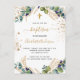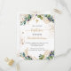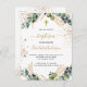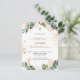 Un arrière - plan blanc décoré de verdure d'eucalyptus et de feuilles dorés et de parties scintillant en faux or tombe. Personnalisez et le nom des enfants et les détails de la cérémonie. Lettres noires et dorées. Retour : arrière - plan blanc avec gouttes de parties scintillant en faux or, design de carte postale. Conseil : Si vous ne voulez pas qu'il ressemble à une carte postale, cliquez sur customiser, allez à l'arrière et retirez le séparateur et le timbre postal.