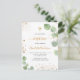 Un arrière - plan blanc décoré d'une végétation d'eucalyptus et d'une poussière de parties scintillant en faux or. Personnalisez et le nom des enfants et les détails de la cérémonie. Lettres noires et dorées. Non sexiste. Retour : arrière - plan vert, design de carte postale. Conseil : Si vous ne voulez pas qu'il ressemble à une carte postale, cliquez sur customiser, allez à l'arrière et retirez le séparateur et le timbre postal.