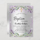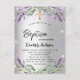 Une invitation moderne, élégante et glamour pour un baptême célébrant une petite fille. Un arrière - plan faux argenté avec parties scintillant violette, étincelants, fleurs de lavande, fleurs et végétation d'eucalyptus. Le nom est écrit avec un script de style moderne écrit à la main. Personnalisez et ajoutez vos détails.