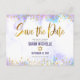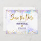 Assurez-vous que tous vos amis et proches pourront célébrer le Bat Mitzvah de votre fille ! Envoyez cette carte postale "Épargnez la date" moderne et étincelante avec une feuille d'or et des points de strass, ainsi qu'une typographie élégante sur un fond aquarelle violet clair personnalisable. Personnalisez le texte avec le nom et la date du Bat Mitzvah. Votre message personnalisé, une étoile de David dorée et votre adresse de retour ornent le verso. Garantit une touche de style et de plaisir pour cette occasion spéciale !