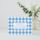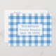 Invitations proches d'une réunion de famille avec des cartes postales représentant des carrés bleu, blanc et bleu clair dans un buffle classique coche plaid avec jusqu'à 3 lignes de texte dans un rectangle blanc au centre sur l'avant. La date, l'heure, l'emplacement et les coordonnées sont au verso. Parfait pour un barbecue annuel, un pique-nique ou une nouvelle tradition. Personnalisez-le avec votre nom et les détails de votre parti dans la barre latérale. Cliquez sur le lien Collection Rocklawn Arts pour coordonner les approvisionnements de fête. numériquement créé une image. Copyright ©Claire E. Skinner. Tous droits réservés.