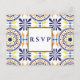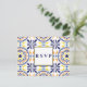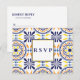 Cette carte de réponse de mariage inspirée de la Méditerranée présente des bordures de carreaux espagnols traditionnels flamboyants et élégants dans des tons jaune et bleu marine.