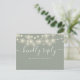 Une élégante carte RSVP script avec de jolies lumières à cordes et une typographie moderne sur un arrière - plan vert sage. L'inverse vous donne vos détails et une demande amusante de chant invité. Conçu par Thisisnotme©