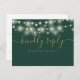 Une élégante carte RSVP script avec de jolies lampes à cordes et une typographie or moderne sur un arrière - plan vert émeraude. L'inverse vous donne vos détails et une demande amusante de chant invité. Conçu par Thisisnotme©