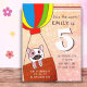 Chat mignon en Ballon à air chaud rose Parties scintillant fille Anniversaire Carte postale Invitation. Chat blanc et gris dans une montgolfière volant dans le ciel. Tout le texte est personnalisable.