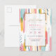 La carte postale d'invitation chic de Titan Studios conviendra à tous ceux qui créent une douche nuptiale dans un style artistique abstrait. Cette carte postale d'invitation à l'aquarelle à la mode apparaît en bleu et rose vif avec des rayures vertes et jaunes et riches et vives et des taches sur un arrière - plan motif abstrait. Cette carte postale d'invitation est ornée de coins dorés. Votre texte de célébration apparaît en lettres sans serif tendance. Ils sont parfaits pour cette future mariée artistique. Il est simple de les customiser pour en faire les vôtres. Nous sommes honorés de faire partie de votre occasion spéciale.