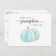 Une conduite mignonne et joyeuse par carte postale invitation à la douche bébé garçon. L'avant est composée de "A Sweet Little Citrouille is On His Way", écrit dans un mélange de typographie moderne et d'écriture élégante, et d'une aquarelle bleu pastel d'un citrouille. Au contraire, "baby shower" est écrit dans le même script élégant et vous pouvez personnaliser le nom de la mère et conduire par des détails de douche dans une typographie moderne minimale.