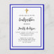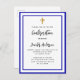 Une invitation moderne, élégante et de confirmation. Un arrière - plan blanc décoré de cadres bleus royaux et d'une croix dorée. Personnalisez et ajoutez un nom et des détails. Lettres de couleur noire.