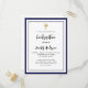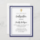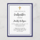 Une invitation moderne, élégante et de confirmation. Un arrière - plan blanc décoré de cadres bleu marine et d'une croix dorée. Personnalisez et ajoutez un nom et des détails. Lettres de couleur noire.