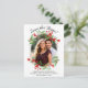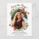 Cette belle carte postale est un excellent moyen de faire connaître à vos amis et votre famille votre mariage à venir. La façade est décorée dans un style agréable avec votre photo encadrée de motifs d'aquarelle de fleurs rouges et de verdure. Voici le titre :Save the date! avec de l'espace pour vos noms, le mariage, date & info sur l'invitation. Le dos a un titre amusant en lisant "crayon nous en" avec de l'espace pour une note spéciale incluant tous les détails comme votre site mariage.