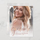Cette invitation à la carte postale élégante et branchée de grand parti présente deux photos du diplômé. Sur le devant, il y a décontracté script d'or faux rose moderne avec le nom de la grad, l'école, et l'année de classe. Au dos se trouve une deuxième photo du diplômé, estompée, avec toutes les informations de votre parti clairement imprimées sur une superposition. Une invitation à la remise de diplômes simple et élégante qui mettra en valeur les photos personnelles préférées de votre diplômé !