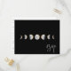 Cartes de réponse de mariage avec phases de lune aquarelles dorées, avec demande de chanson. La carte comporte une illustration de phase de lune sur fond noir, un graphique de script "RSVP" blanc, un cadre d'adresse de fleurs sauvages au dos et plusieurs lignes pour vos informations de RSVP personnalisées.