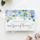Seriez-vous ma dame d'honneur ? Demandez à une personne spéciale d'être votre demoiselle d'honneur avec cette carte de proposition fleurie qui présente des hortensias bleus aquarelle, des roses ivoire et de la verdure dans un design de guirlande florale. La palette de couleurs est magnifique pour les mariages de printemps, d'hiver ou sur le thème du jardin. Vous pouvez facilement ajouter votre propre message et le nom de votre dame d'honneur. Que vous demandiez à votre sœur, cousine ou meilleure amie, cette carte de dame d'honneur à l'hortensia est une façon réfléchie de commencer votre voyage de cortège nuptial.