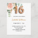 Une élégante invitation pour une Soirée 16, 16ème anniversaire. Un arrière - plan blanc chic. Décoré d'or rose et de rose pastel rose vif, de fleurs roses, de feuilles d'eucalyptus verts, de sprigs, de verdure et de faux sprigs d'or. Personnalisez et le nom et les détails du parti. Lettres noires et dorées. Le nom est écrit avec un script de style moderne écrit à la main. Le numéro 16 est écrit avec une police de style ballon doré. Retour : Couleur arrière - plan rose or, design carte postale. Conseil : Si vous ne voulez pas qu'il ressemble à une carte postale, cliquez sur customiser, allez à l'arrière et retirez le séparateur et le timbre postal.