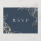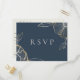 Belle carte de réponse de mariage avec fleurs et feuillage élégants en or et ligne artistique, avec demande de chanson. La couleur de fond présentée dans un bleu marine tendance peut être personnalisée.