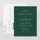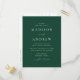 Carton d'invitation de mariage minimaliste et moderne avec les détails de votre mariage en lettrage blanc et des accents de calligraphie. Le fond vert forêt peut être changé en une couleur de votre choix. Personnalisez le verso du carton d'invitation de mariage chic avec votre adresse de retour, la date de réponse souhaitée, le site web du mariage et les instructions pour les invités en utilisant les modèles de texte fournis. Conçu pour se coordonner avec notre collection de mariage Modern Elegance.