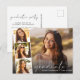 Elégante carte postale faire-part de remise de diplômes et invitation à la fête avec la photo du diplômé superposée avec une bande de trois petites photos de carré et "Graduate" dans un script blanc moderne et leur nom et année de classe dans une simple typographie blanche. Au contraire, ajoutez les détails de la fête.