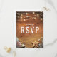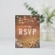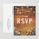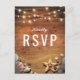 Carte de réponse de destination de plage avec un fond de grange en bois rustique, des guirlandes lumineuses, une plage de sable avec une étoile de mer et des coquillages.