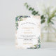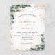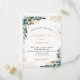 Un arrière - plan blanc décoré de verdure d'eucalyptus et de feuillage doré. Personnalisez et ajoutez vos noms et les détails du mariage. Lettres noires et dorées. Retour : ajoutez votre weburl à votre site mariage pour RSVP ou détails.