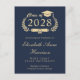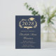 Carte d'invitation de fête de remise de diplôme universitaire bleu foncé moderne avec "Promotion de" dans une illustration dorée de couronne de laurier avec un chapeau de diplômé et un diplôme et le nom du diplômé dans une écriture dorée élégante. Ajoutez leur école, spécialité, distinctions ou projets futurs et les détails de la fête de remise de diplôme.