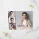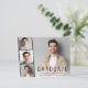 Carte d'invitation de fête de remise des diplômes moderne minimaliste avec la photo du diplômé superposée d'une bande de trois photos carrées plus petites et "Diplômé," son nom, école et année de promotion en typographie simple. Au verso, ajoutez les détails de la fête.