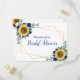 Les invitations à la douche nuptiale sont décorées de tournesol aquarelle avec des roses bleus et un cadre géométrique en faux or. Le texte de l'invitation est au verso de la carte. Personnalisez-les avec votre propre libellé. Objets correspondants également disponibles. Veuillez consulter la page de collection ou visiter notre magasin pour voir la gamme complète.