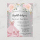 Une invitation à la Fête des mariées moderne, élégante et glamour. Un arrière - plan à l'aspect faux argent avec parties scintillant en faux rose, pétille, une robe et des fleurs roses rousses. Le nom est écrit avec un script de style moderne écrit à la main. Personnalisez et ajoutez les détails de votre fête.