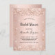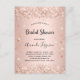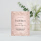 Pour une élégante douche nuptiale. Un arrière - plan de couleur or rose. Décoré d'or rose, de faux étincelles roses. Personnalisez et ajoutez le nom de la mariée et les détails du parti. Le nom et le texte : Fête des mariées sont écrits avec un script de style manuscrit. Retour : arrière - plan or rose, design carte postale. Conseil : Si vous ne voulez pas qu'il ressemble à une carte postale, cliquez sur customiser, allez à l'arrière et retirez le séparateur et le timbre postal.