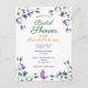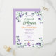 Une invitation simple et élégante à la Fête des mariées. Sur le devant : un élégant arrière - plan blanc décoré de fleurs violettes, de bleuets violets et d'un petit oiseau chantant. Modèles pour le nom de la mariée et les détails du parti. Le nom est écrit avec un script de style moderne écrit à la main. Texte en violet, vert une couleur dorée. Retour : arrière - plan violet.