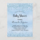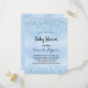 Pour une baby shower, célébrant un bébé garçon. Un fond métallisé faux bleu clair. Décoré de fausses gouttes scintillantes, aspect de peinture qui coule. Modèles pour le nom de la future maman et les détails de la fête. Le nom et le texte : Baby Shower sont écrits avec un style de lettrage manuscrit.