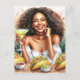 Définissez le ton pour une soirée amusante avec cette carte postale d'invitation vibrante Tacos & Margarita, représentant une femme joyeuse aux cheveux bouclés et à la peau brune levant un margarita avec un sourire éblouissant - entourée de tacos colorés, de garnitures fraîches et de touches d'aquarelle. Son air confiant et insouciant ainsi que son énergie radieuse font de ce design le choix parfait pour toute célébration où les rires, la bonne nourriture et les boissons fortes sont au menu.