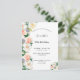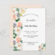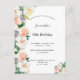 Une invitation à l'anniversaire de 50ème anniversaire fleuri tendance (ou tout âge) en blanc, corail et pêche. Un arrière - plan blanc chic à l'avant. Décoré de grandes fleurs verdoyantes aux couleurs de l'eau, de fleurs blanches, de corail et de pêche. Modèle pour votre nom et informations de fête. Le nom est écrit avec un script moderne de style manuscrit. Retour : arrière - plan rose couleur or. Parfait pour une fête estivale ! Conseil : Si vous ne voulez pas qu'il ressemble à une carte postale, cliquez sur customiser, allez à l'arrière et retirez le séparateur et le timbre postal.