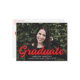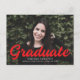 Cartes postales simples et élégantes pour l'invitation à la fête de remise de diplômes avec la photo horizontale du diplômé avec "Graduate" dans un script rouge gras. Personnalisez l'invitation de la fête de remise de diplômes en y ajoutant le nom du diplômé, le nom de l'école et l'année de remise de diplômes. L'invitation inverse pour afficher l'adresse de retour et les détails de la fête de remise.