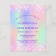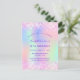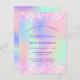 Une invitation à la fête d'anniversaire de 18e anniversaire, féminine et féminine (ou tout âge). Devant : Un arc-en-ciel, arrière - plan de couleur holographique en violet, rose, vert menthe. Décoré de confettis rose vif. Personnalisez et ajoutez un nom et des détails du parti. Le nom est écrit avec un script de style écrit à la main, des lettres de couleur violette.