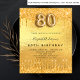 Une invitation moderne, élégante et glamour pour une fête de 80e anniversaire. Un arrière - plan à l'apparence métallique en faux or avec des gouttes de parties scintillant, la peinture goutte à goutte. Le nom est écrit avec un script de style moderne écrit à la main. Personnalisez et ajoutez les détails de votre fête. Le numéro 80 est écrit avec une police de style ballon, script. Conseil : Si vous ne voulez pas qu'il ressemble à une carte postale, cliquez sur customiser, allez à l'arrière et retirez le séparateur et le timbre postal.