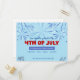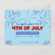 Invitation vos proches pour fêter le 4 juillet avec cette carte d'invitation festive avec un arrière - plan bleu ciel orné de mousseux bleu indigo et blanc en cascade du bord supérieur. La légende en gras "4 juillet" occupe le devant de la scène, vous laissant suffisamment d'espace pour customiser les détails de votre invitation. Ce design saisit sans effort l'esprit du Jour de l'Indépendance avec ses couleurs patriotiques et ses accents étoilés. #StarryJuly4thInvite #SkyBlueBackground #IndigoSparkles #BoldTypography #CustomizableInvitation #PatrioticCelebration