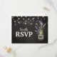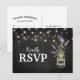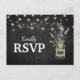 Cartes de réponse de mariage country chic avec un fond de tableau noir craie rustique, des guirlandes lumineuses, un pot Mason avec des fleurs de lavande violettes, enveloppé dans du jute avec les initiales du couple et un modèle de mariage facilement personnalisable.