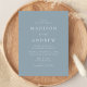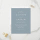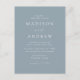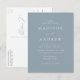 Carte postale minimaliste et moderne avec vos détails mariages en lettres blanches avec accents de script de calligraphie. L'arrière - plan bleu poussiéreux peut être changé en une couleur de votre choix. Personnalisez le dos de la carte postale chic faire-part de mariage avec votre adresse de retour, le site Web du mariage, les images, etc. Conçu pour coordonner avec notre collection de mariages Modern Elegance.