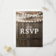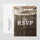 Carte de réponse de mariage avec guirlande lumineuse rustique | Fond de tonneau de chêne de grange de campagne, lumières de chaîne scintillantes et formulation de mariage moderne. Trouvez d'autres cartes de réponse de mariage de barnyard sur http://www.zazzle.com/special_stationery