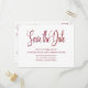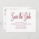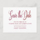 Save the Date est écrit en calligraphie intemporelle. Cette carte postale bordeaux moderne et minimaliste, à l'exception de la carte postale datant, est chic et sophistiquée. Il y a de la place au verso pour ajouter vos propres commentaires sur votre mariage. Très facile à customiser.