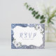Cadre brillant argent et bleu parties scintillant et scénario "RSVP" avec floral bleu et blanc poussiéreux, élégant et élégant. Idéal pour un mariage moderne, un mariage romantique et un mariage de jardin botanique. Voir toutes les pièces correspondantes dans la collection ci-dessous.