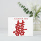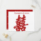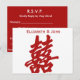 Ce Mariage moderne Double Bonheur RSVP est composé du personnage "Double Bonheur" avec les noms de la mariée et du marié à l'avant. Le verso comprend des informations RSVP incluant les noms, l'acceptation, la date limite RSVP et le choix d'entrée.
