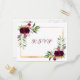 Une carte RSVP élégante pour un mariage avec des modèles pour répondre par date, noms, etc. Un cadre en faux or avec plumes aquarellées, roses, fleurs en bordeaux. Arrière - plan blanc, lettres bordeaux.