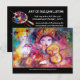 Amour romantique entre Arlequin et Colombine : Joueur de violon coloré et fantaisiste, une belle femme blonde en costumes scintillants à plumes avec des embellissements bordeaux rouge sur le dos de la carte. . Peinture à l'aquarelle par Bulgan Lumini (c) en rose vif, fuchsia, vert, rouge, bleu, jaune, avec des étincelles d'or inspirées de la Comédie de l'Art (Commedia dell'arte) et du Carnaval de Venise .