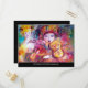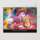 Amour romantique entre Arlequin et Colombine : Joueur de violon coloré et fantaisiste, une belle femme blonde en costumes scintillants à plumes avec des embellissements rouges bordeaux au dos de la carte . .Peinture à l'aquarelle par Bulgan Lumini (c) en rose vif, fuchsia, vert, rouge, bleu, jaune, avec des étincelles dorées inspirées de la Comédie de l'Art (Commedia dell'arte) et du Carnaval de Venise .