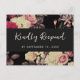 Joli rsvp floral avec choix de repas comprend élégant script de calligraphie "gentiment répondre" sur le front noir avec un beau motif floral romantique, et options de repas avec adresse de retour en texte noir sur le dos couleur crème.