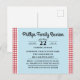 Carte postale famille bleue avec une bordure de nappe à damiers rouge et blanc et des champs de texte personnalisables pour vos informations de réunion.