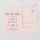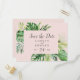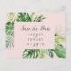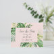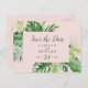 Ce blush sauvage de palme tropicale, sauf la carte postale date est parfait pour une plage ou un mariage de destination. Le design comprend un éventail exotique de feuilles de bananiers verts aquarelles, fougères, feuillage, plantes botaniques et verdure sur un arrière - plan rose pâle pour une atmosphère estivale tropicale.