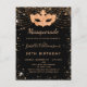 Pour une Masquerade élégante, 50e (ou tout âge) anniversaire. Un arrière - plan noir élégant. Décoré avec de la poussière de parties scintillant en faux or et un masque masqué. Personnalisez et ajoutez un nom, un âge et des détails de la fête. Le nom est écrit avec un script de style écrit à la main. Retour : conception de carte postale.